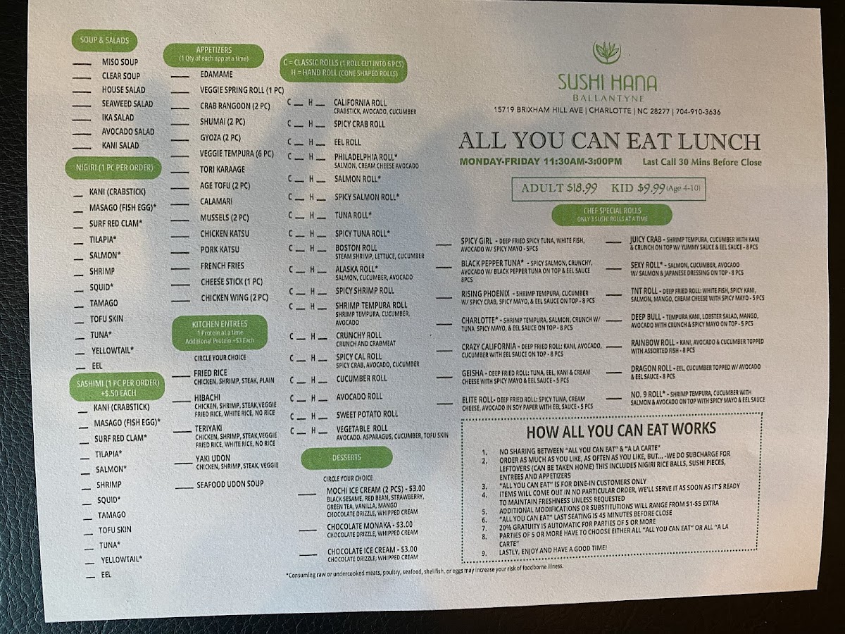 Welcome to SushiHana Ballantyne, where sushi dreams become a delightful reality! Nestled in Charlotte, NC, at 15719 Brixham Hill Ave, this vibrant eatery offers an all-you-can-eat experience that leaves patrons craving more. The star of the menu is undoubtedly their renowned Charlotte Roll, a perfect fusion of shrimp tempura, salmon, and tuna, all drizzled with eel sauce and spicy mayo. Other must-tries include the Blk Pepp Tuna Roll and the colorful Rainbow Roll.
